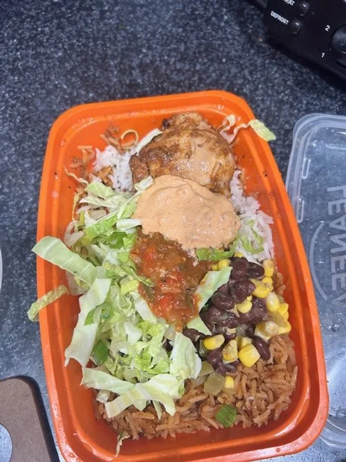 I keep all the ingredients in separate containers in the fridge and make them up as I go because each week I have two different proteins to rotate through to keep myself from getting bored. When it comes time to make a bowl I combine the yogurt with salsa as described in the ingredient list. To prepare a bowl I add the rice and chicken in a bowl and throw it in the microwave for a minute or so. Then I add the corn mix and some greens and top with the sauce I made…. all my bowls always have sauce. Healthy doesn’t have to be boring. In fact, for most people boring isn’t sustainable.
