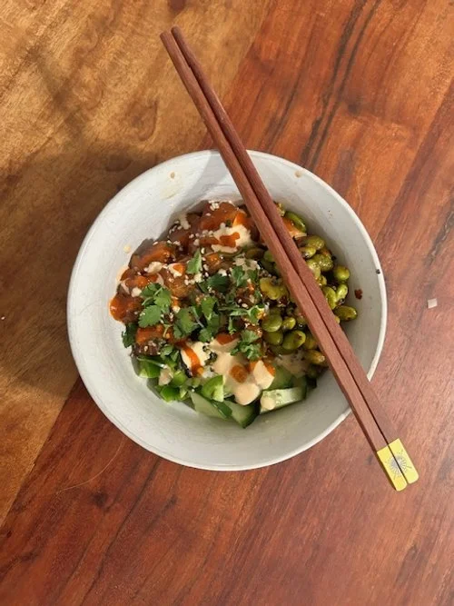 Let’s start with getting that fish marinating. Remove pin bones and skin from fish, then cube into bite-size pieces. In a medium size bowl combine cubed fish with equal parts of the following: soy sauce, rice vinegar, and sesame oil. Then sprinkle a couple pinches of sesame seeds in the mixture. Set the fish in the refrigerator and let it do its thing while you prepare the rest of the bowl. Prepare your sushi rice by first rinsing the rice then adding 1 cup of rice to two cups of water in a small pot with a lid, or a rice maker if you’re so lucky…. if you’re not that lucky turn the pot to medium-high heat until the water begins to boil, then turn off the burner. Allow the pan to remain on the burner until no more water is visible in the pain, and the rice appears fluffy. While the rice is going prepare the edamame. Turn a sautee pan to medium heat and add a quick spray of avocado oil to the pan. Add frozen edamame, garlic, and red pepper flakes to the pan and give it a good stir. The edamame is done when it’s slightly browned and tender, add salt to taste. Next, chop up some cucumbers, cilantro, and maybe even some spring mix if you have some in the fridge. Lastly, make the sauce. Instead of sriracha mayo, I like to do a sriracha yogurt sauce to cut down on the fat. Combine yogurt, sriracha, and 1 tablespoon of the rice wine vinegar in a bowl and stir until well mixed.